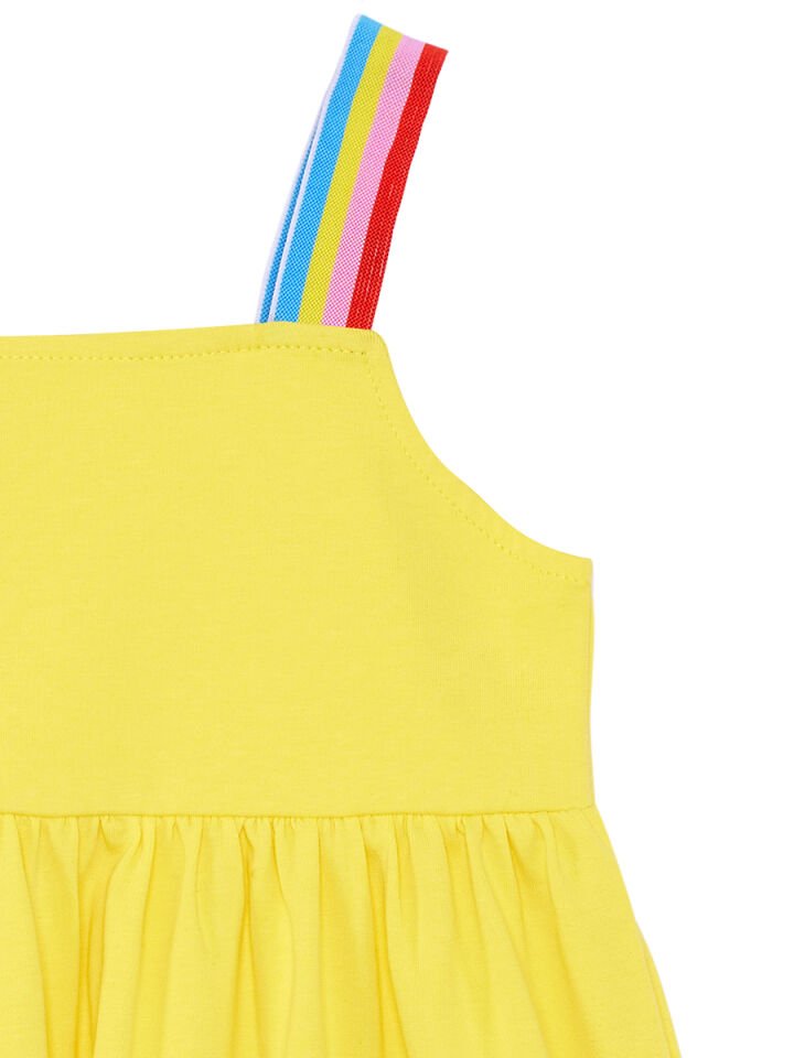 Pamuklu penye kumaştan kız çocuk, sarı elbise. Üzeri sevimli arı baskılıdır. Omuz askıları renk bloklu lastikten yapılmıştır. Tüm Denokids ürünleri Çocuk Güvenlik Kuralları'na uygun olarak üretilmektedir. Çocuğunuzun tenine bir zarar gelmemesi için tüm ürünler, iğne kırıklarını tespit edebilen metal dedektörlerinden geçirilmektedir. %95 Pamuk %5 Elastan