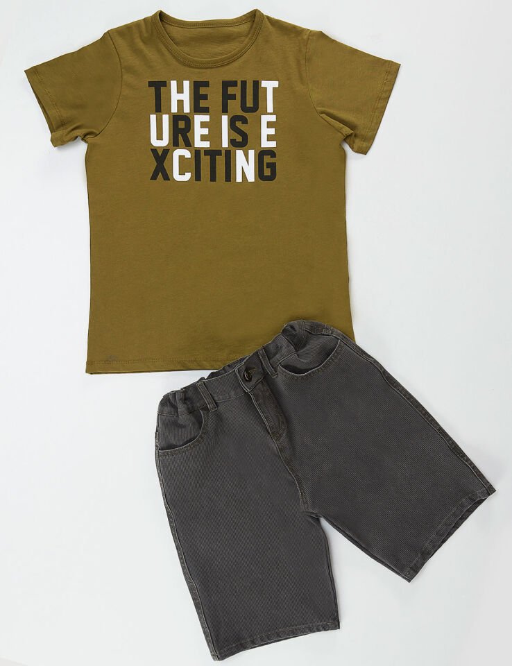 2 parça erkek çocuk takım. Haki yeşil baskılı t-shirt ve gri kot şort. Alt: %96 pamuk %4 elastan, Üst: %92 pamuk %8 elastan