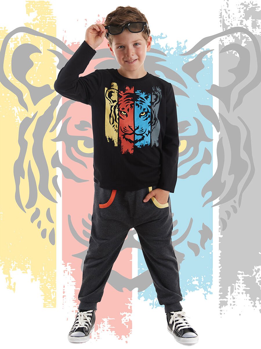 2 parça erkek çocuk pantolon ve t-shirt takım. Uzun, pamuklu penye kumaştan t-shirt. Üzeri kaplan baskılıdır. Takımın pantolonu kamuflaj antresit melanj, kalın kışlık kumaştan, düşük ağ kesimli üretilmiştir. Önü kanguru ceplidir. Beli lastikli ve kordonludur. Tüm MSHB&G ürünleri çocuk güvenliği düşünülerek üretilmiştir ve iğne dedektörlerinden geçirilmiştir. Üst: %94 Pamuk %6 Elastan - Alt: %63 Polyester %37 Pamuk