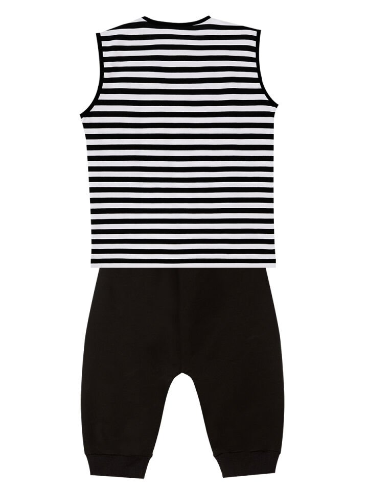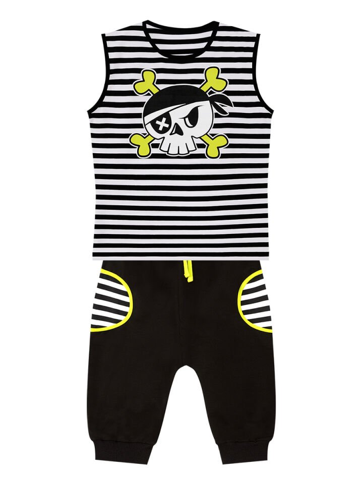 2 parça erkek takım. Pamuklu penye kumaştan, çizgili, kolsuz t-shirt. Üzeri korsan kurukafa baskılı. Düşük ağ kesimli, pamuklu kumaştan kapri boy pantolon. İki yanı ceplidir. Beli lastik ve kordonludur. Tüm MSHB&G ürünleri çocuk güvenlik kurallarına uygun olarak üretilmekte ve iğne dedektörlerinden geçmektedir. Üst: % 95 Pamuk %5 Elastan - Alt: %72 Pamuk %23 Polyester %5 Elastan