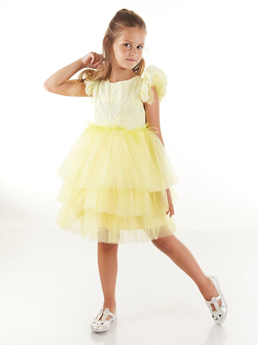Otriş Detaylı Tütü Kabarık Kız Çocuk Sarı Elbise